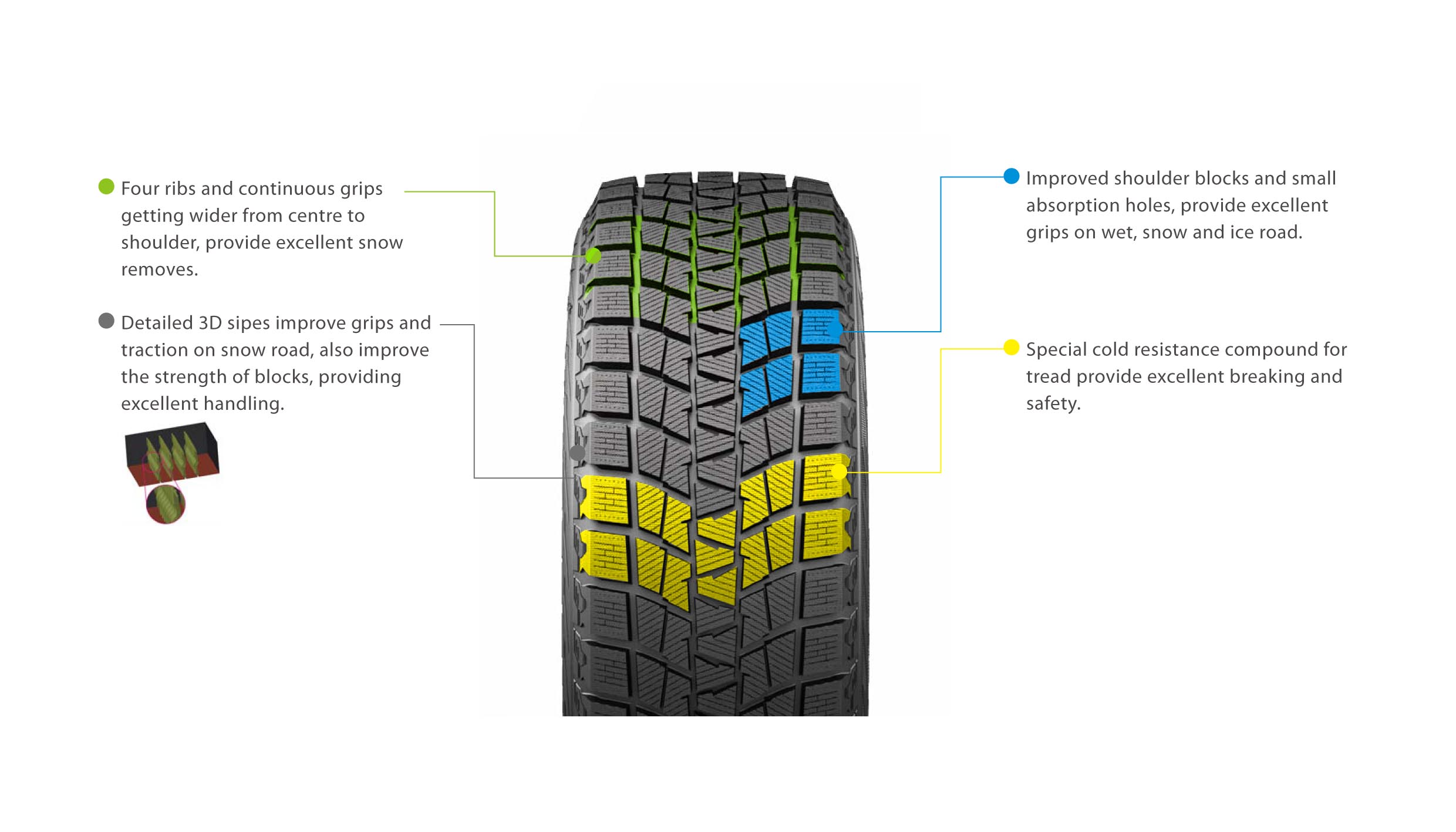 DW501 is specially designed for ice and snow area, providing excellent handling on snow or wet road.
