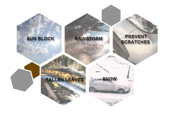| Feature | 1. waterproof, UV and heat insulating. 2. Comes with elastic fasten straps and hooks to keep cover in place. 3. Protection from: Sun, Bird Droppings, Tree Sap, Snow and Ice, Industrial Pollutants, Airborne Dust, Dirt, and UV Light. 4. Easily installed, folding,portable and stored conveniently 5. Storage bag included. |