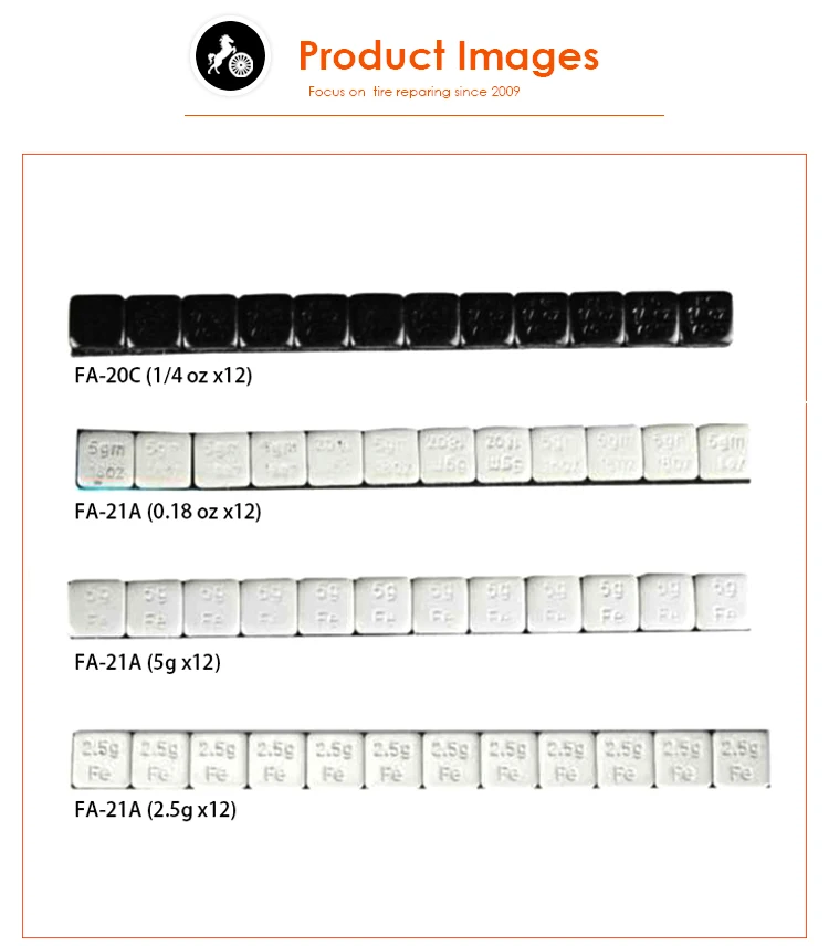 | FA-20C | 1/4oz x12 (3oz) Square | 48 Strips(144oz) per box | Thickness 6.8mm with Tape & Width 13mm | Zinc Plated and Black Powder Coated |