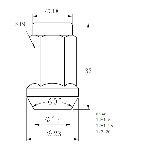 * M12*1.25, M12*1.50, M12*1.75, M14*1.25, M14*1.50, M14*2.0, M16*1.5, M20*1.5, M22*1.5 , 7/16"-20, 1/2"-20, 9/16"-18 etc.