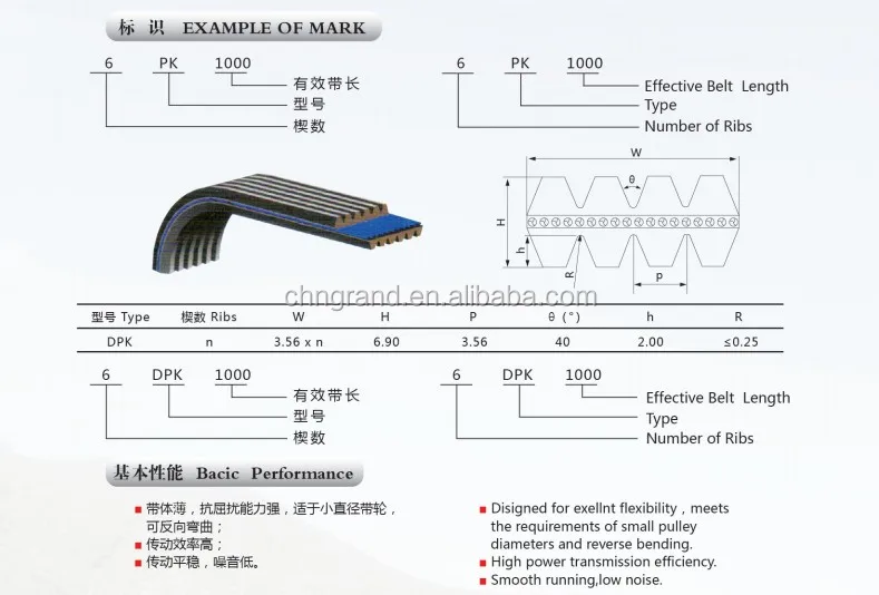 Type | Ribsection(mm) | Angle of rib(o) | Belt Thickness(mm) | Rib Numbers | Length range |