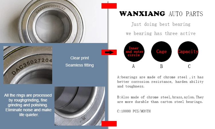 Jiaxing Wanxiang Auto Parts Co., Ltd. was founded in 2006. Specializing in the production of Auto Bearings, including wheel bearings, wheel hub bearings, transmission bearings. Products of high quality, fashionable, widely used in a variety of architecture, not only has the broad masses of the domestic sales market, but also exported to Europe and the United States.