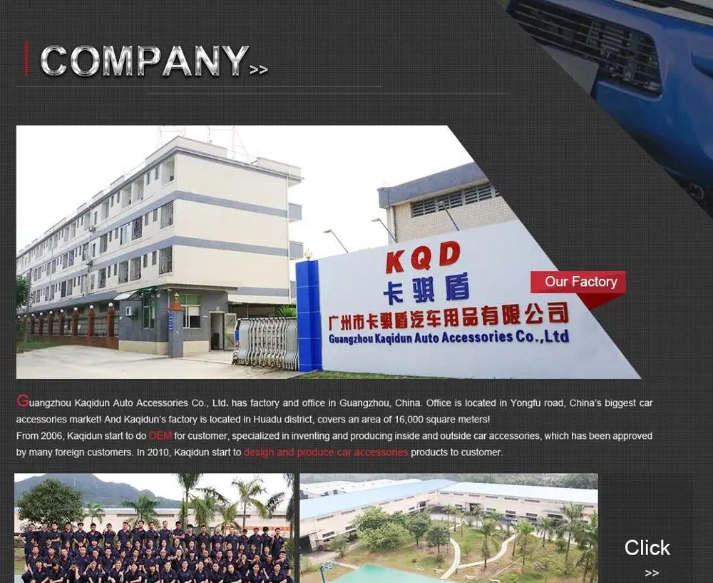 Guangzhou Kaqidun Auto Accessorises Co., Ltd has factory and office in Guangzhou, China. Its office is in E214, The Thrid Phase, Yiyun Plase, Yongfu Road , Baiyun District, Guangzhou, China, covers an area of 10,000 square meters.From 2006 , Kaqidun start to focus on inventing designing and producing inside and outside car accessories.After several years of development,Now factory has has it's own professional team for researching and designing.Guangzhou Kaqidun Auto Accessories Co., Ltd will move on with the Business philosophy of "Changing, for the better future". Kaqidun takes great pleasure to welcome domestic and foreign customers to visit factory and work together.