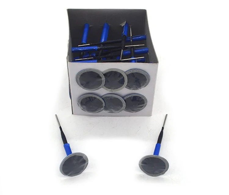 Plug repair unit require no special wire pulling tools. Just insert the plug into the injury from the inside of the tire and pull the repair unit through from the outside. Both the stem and the repair unit are gum coated to provide the most complete bond, both through the injury and on the inner liner. The plug repair patches are black with gray vulcanizing gum and will vulcanize chemically or in a heat curing system.