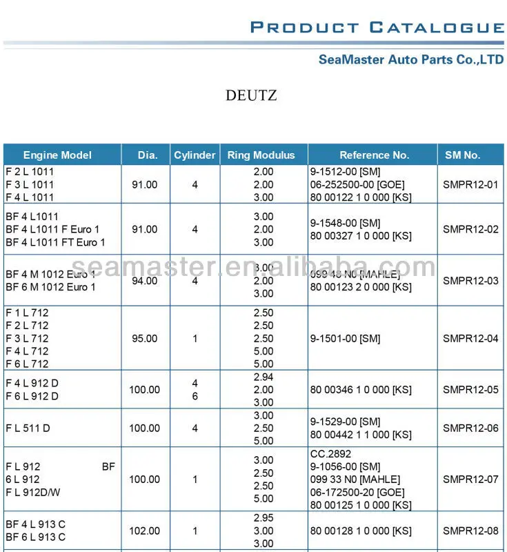 SeaMaster have been in this field for 20 years, Our leading products include Piston and Pins, Piston rings, Liner/Cylinder, Crankshaft, Crown wheel and pinion , Radiator,Element, Valves and Nozzles, Clutch plates, Brake drums and brake hubs, Brake lining and Rivets , Filter .etc.Our products are manufacturered strictly according to ISO9001 and TS16949 standards and we provide high-quality and reliable products.
