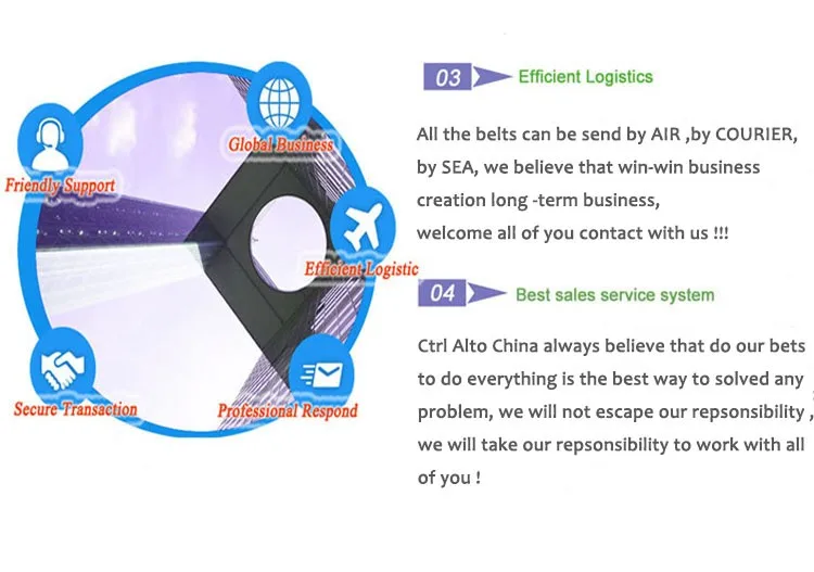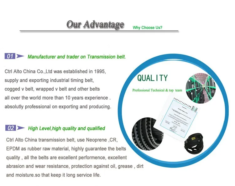 CTRL ALTO CHINA is a manufacturer with trading company in China , We have more than 10 years experience to export all kinds of belts to the worldwide . Industrial Timing belts, Pu Inustrial Timing belts, Wrapped v belts. cogged v belts, mould poly v belt, automotive timing belts , conveyor belt, flat belts and so on. in the mean while, we also support to offer production line of timing belts, cutting machine, jointing machine and mould ect...