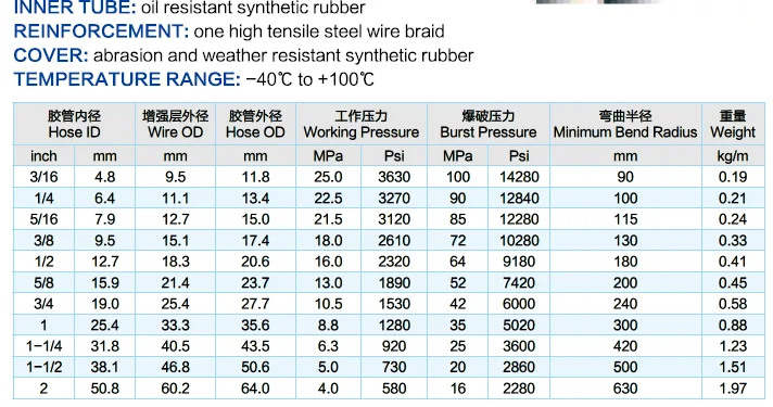 This hose consists of an inner tube of oil synthetic rubber, single wire braid reinforcement, and an oil and weather resistant synthetic rubber cover.