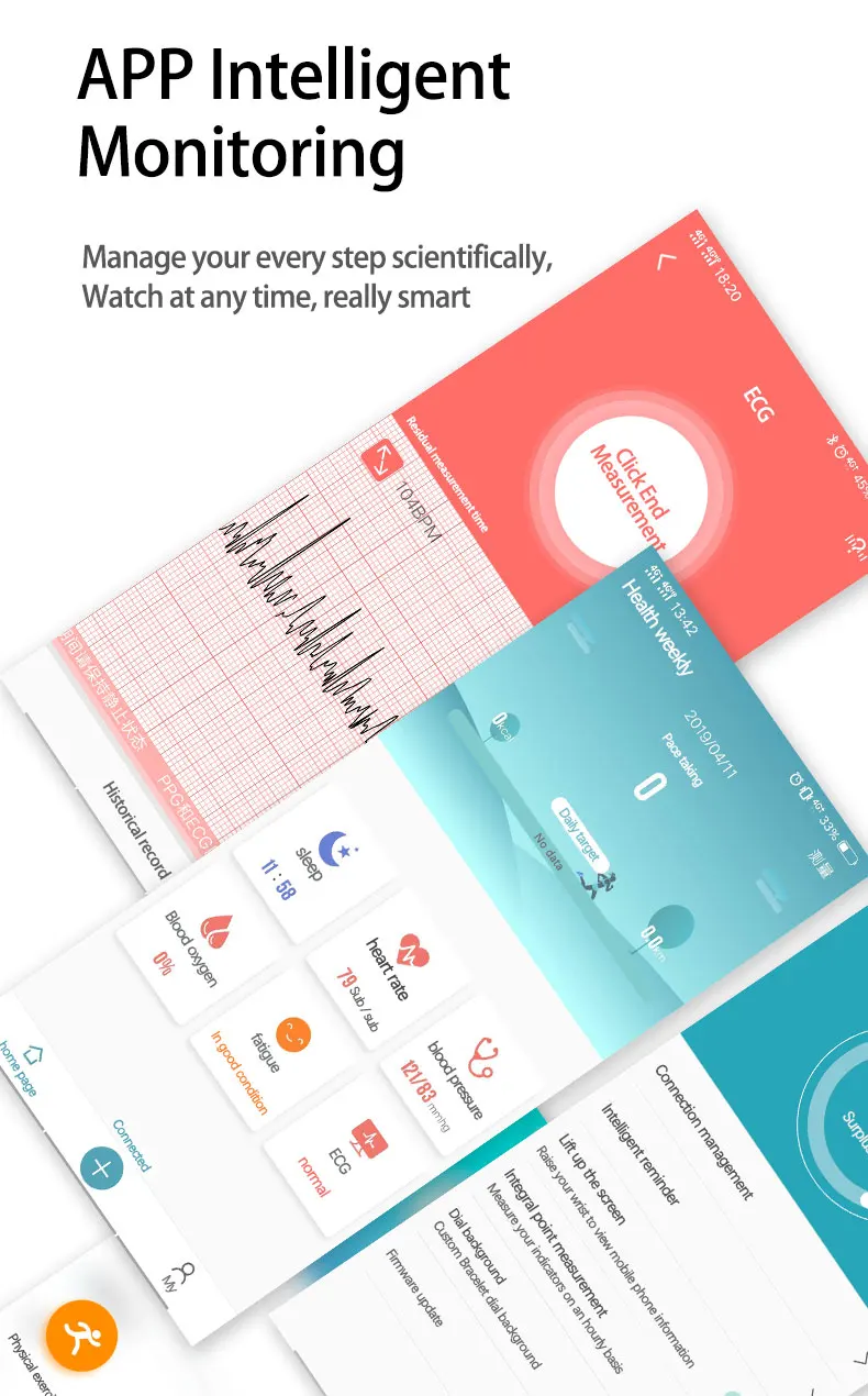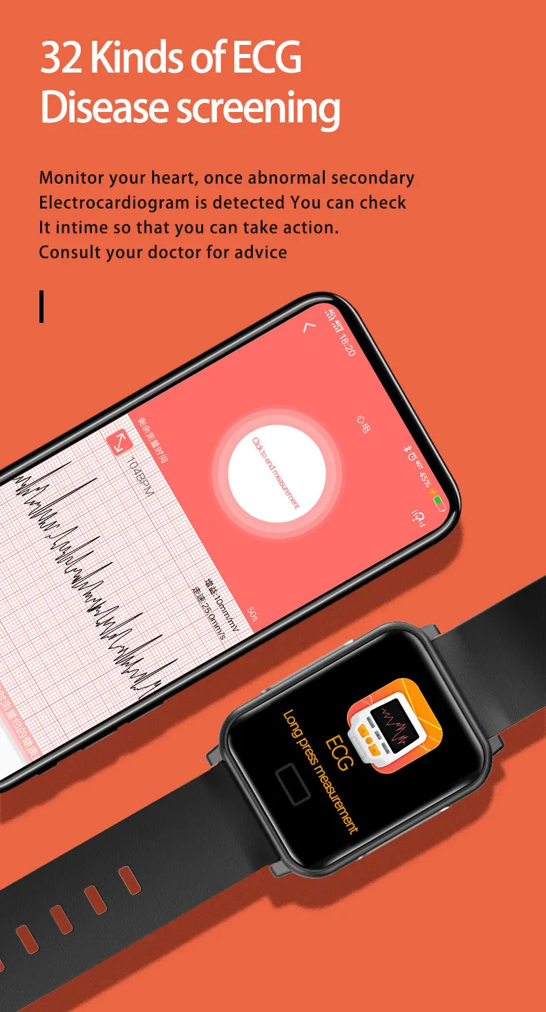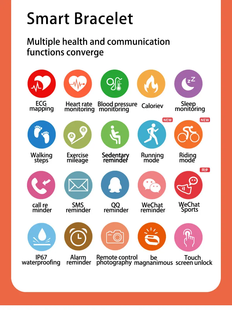 | Features | Multiple health and communication function coverage ECG mapping ,Heart rate,Blood pressure, Sedentary reminder ,walking Steps,Calories,Distance,sleep monitor ,sport,Call/SMS reminder ,Alarm Reminder ,Remoto control photography |