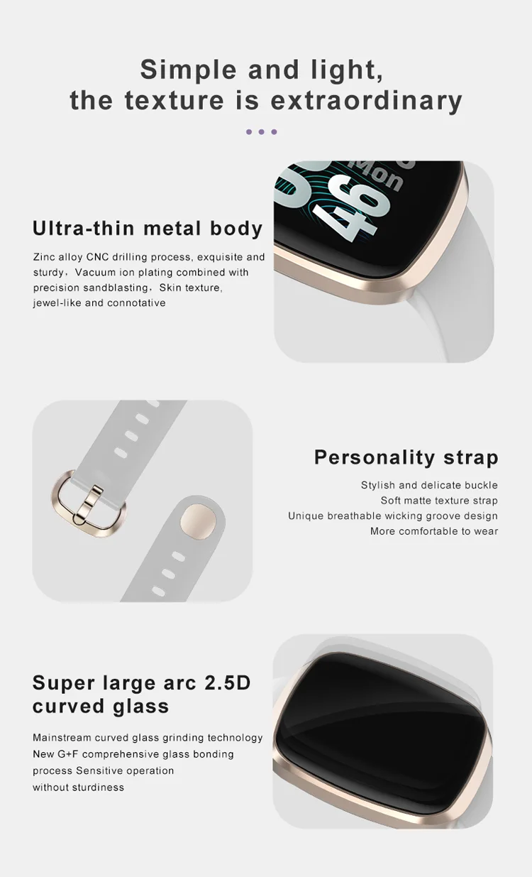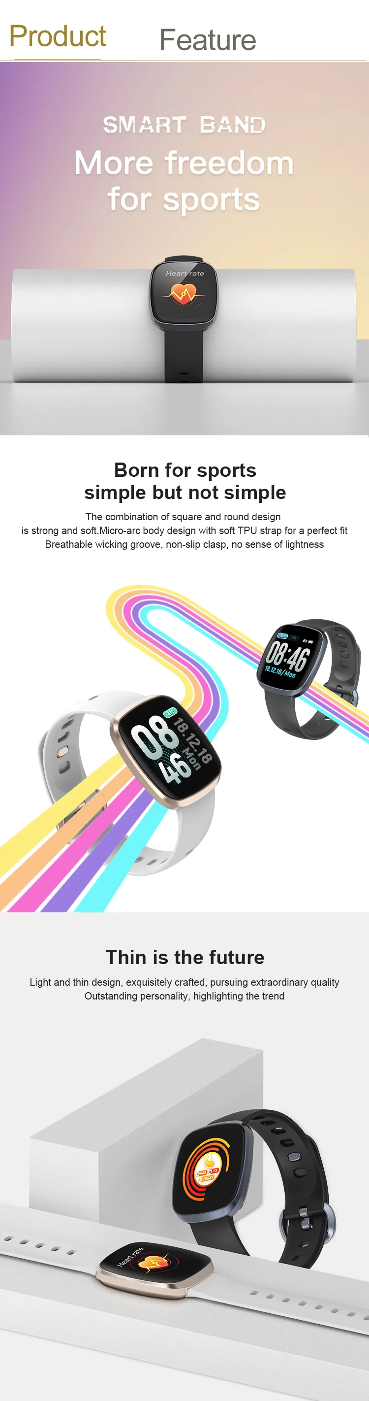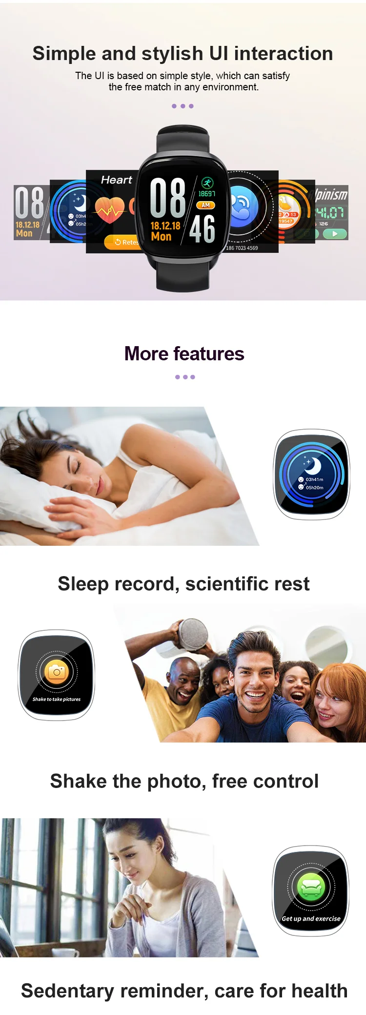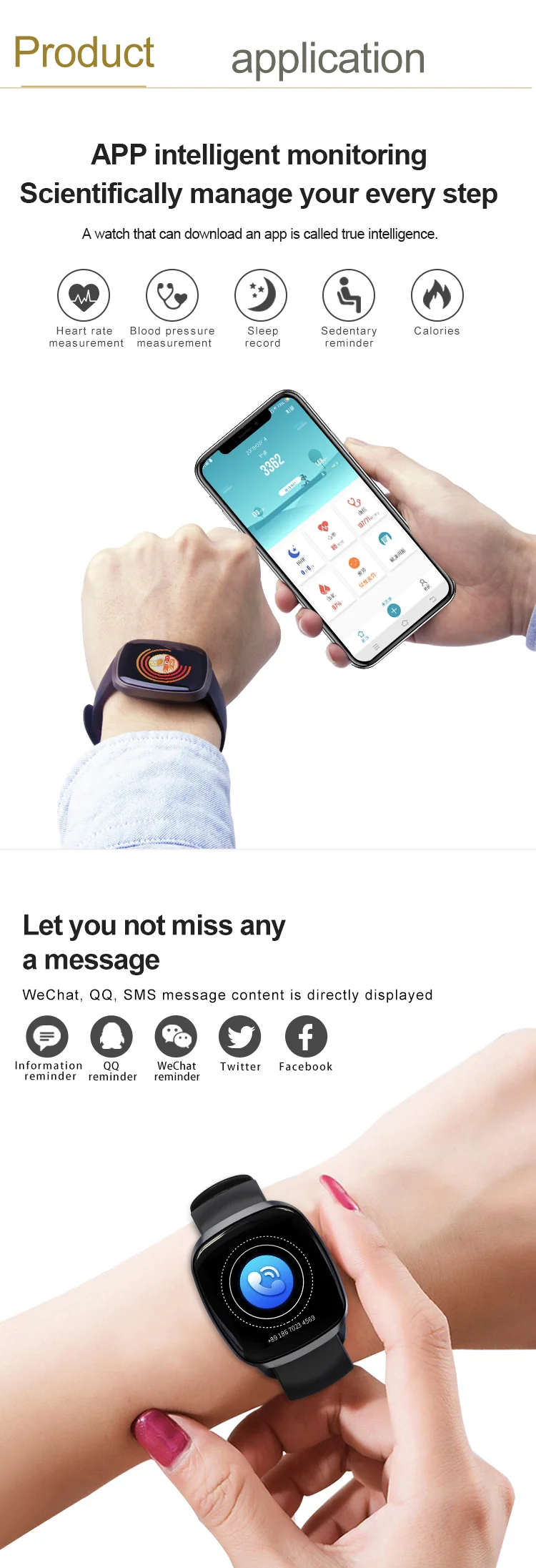 | Features | Heart rate, Blood Pressure,Heart Rate,Step pedometer,Calories Mode ,Distance track,Sleep Monitoring,Incoming Call,checking nine Message from social software(wechat,whatsapp,facebook,twitter,QQ..ect),timer mode,clock mode,Anti-lost,Camera remote control , Find your phone,changeable dia(customizable APP) |