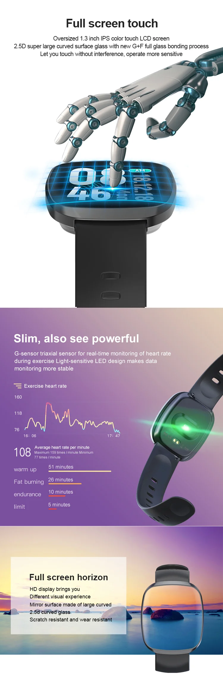 2019 new arrival 2.5D tempered glass full touch screen BT smart watch IP67 and 170mAh battery capacity