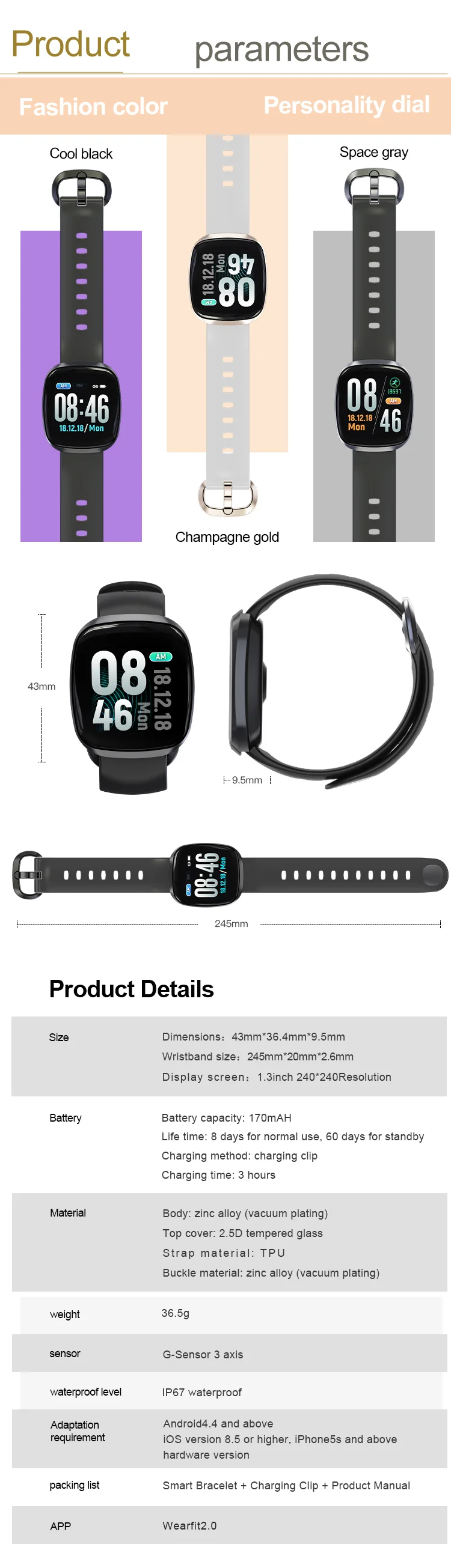 | Sensor | 3 axis acceleration senor photoelectric heart rate sensors |