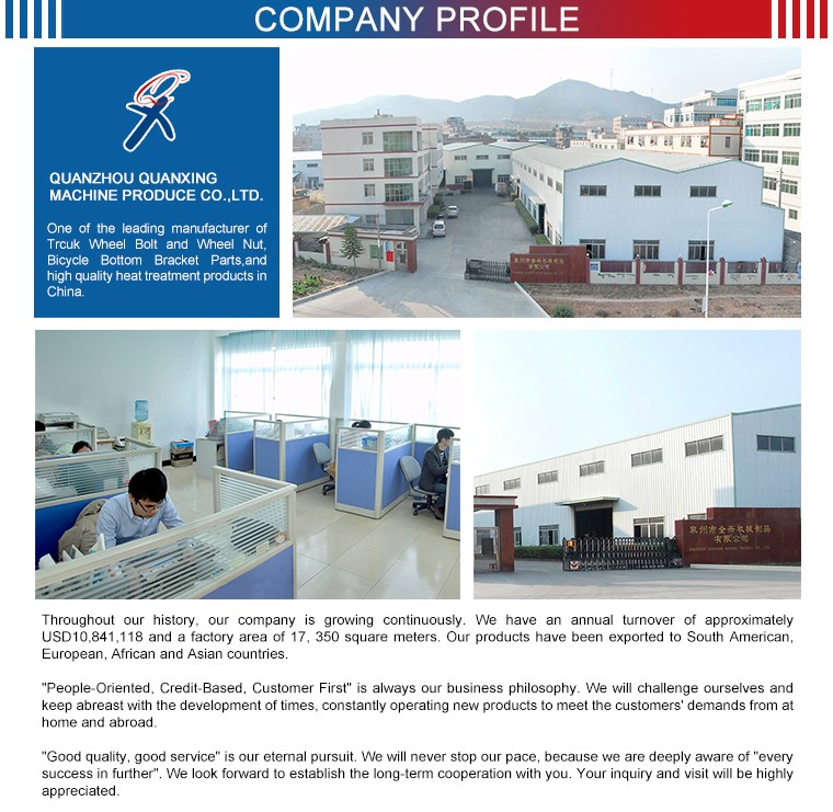 A: We are professional manufacturer of Trcuk Wheel Bolt and Wheel Nut, Bicycle Bottom Bracket Parts,and high quality heat treatment products in China. |