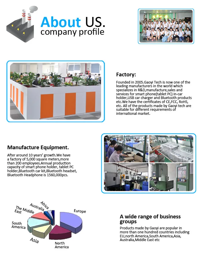 Founded in 2005.Gaoyi Tech is now one of the leading manufacturers in the world which specializes in R&D,manufacture,sales and OEM&ODM services for smartphones in car-holders, usb car charger, homer charger, car fm transmitter and bluetooth products etc.