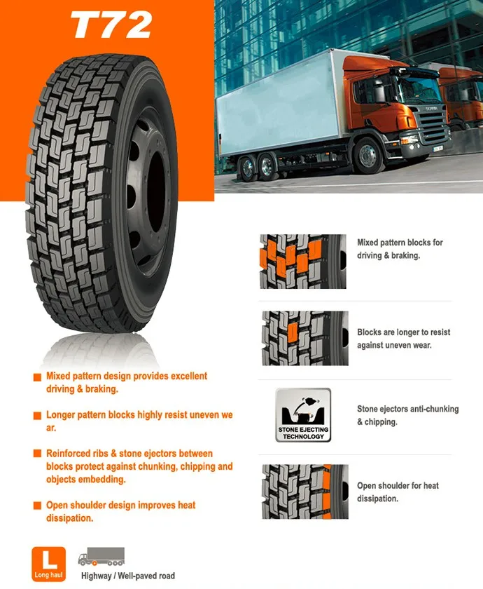Enhanced driving pattern T72 heavy duty truck tires with 315/70R22.5