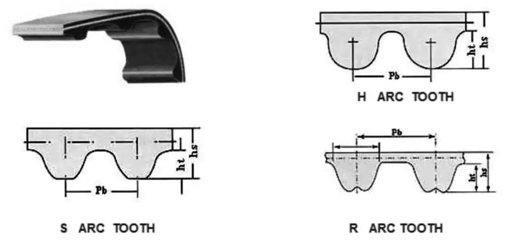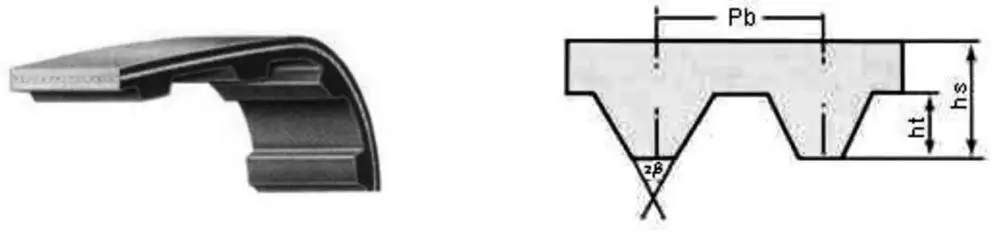 | Type | Pitch Pb(mm) | Tooth height ht(mm) | Belt thickness hs(mm) | Angle β° |