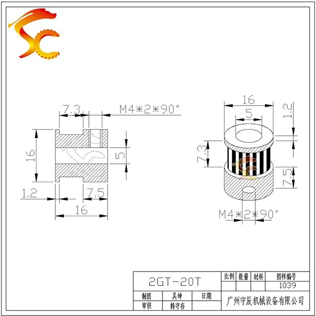 Your location:Home > Guangzhou Shouchen Mechanical Equipment Limited Company > 1039#Engraving Machine parts Synchronous timing 20 teeth bore 5mm belt width 6mm Aluminum Alloy GT2/2M timing pulley
