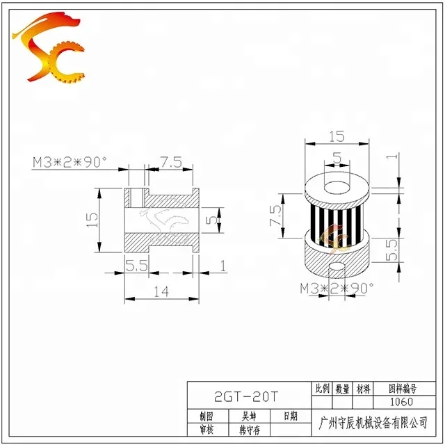 Your location:Home > Guangzhou Shouchen Mechanical Equipment Limited Company > 1060#CNC Parts GT2/2M Synchronous timing 20 teeth bore 5mm belt width 6mm Aluminum Alloy Timing Pulley