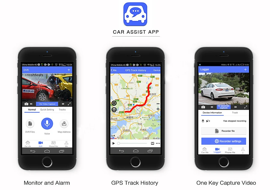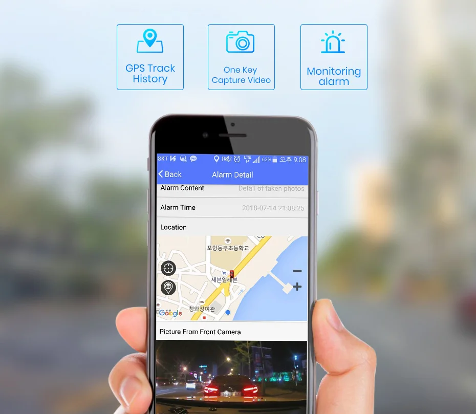 One key to capture 10s video on car assist app via WiFi connection. When the car shakes, your phone would receive a warning and reminding. Press photo capture to take and send a photo automatically.