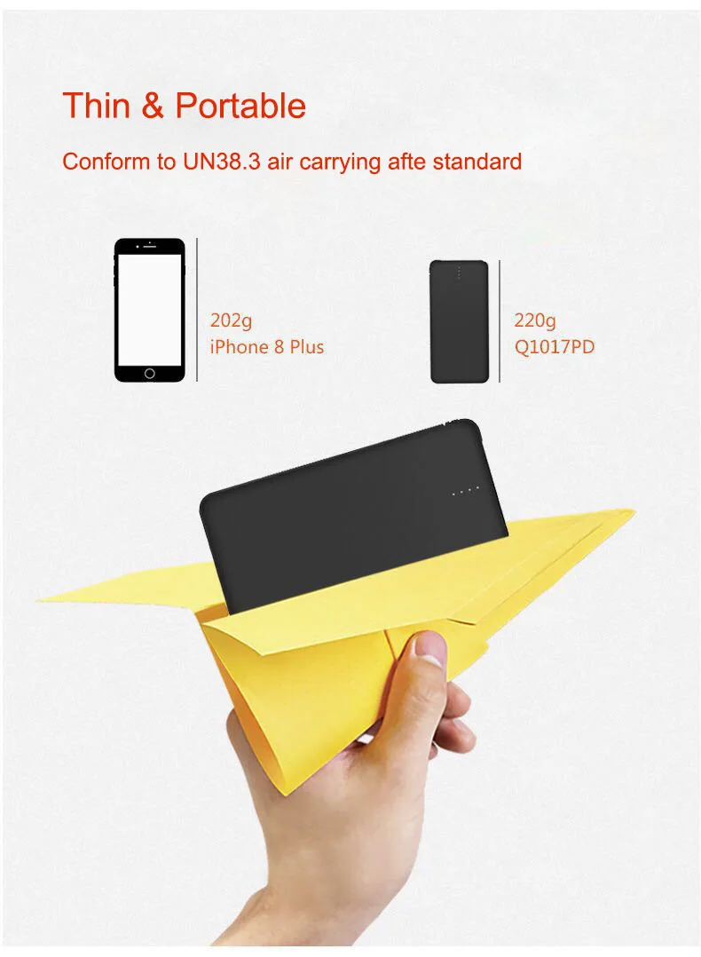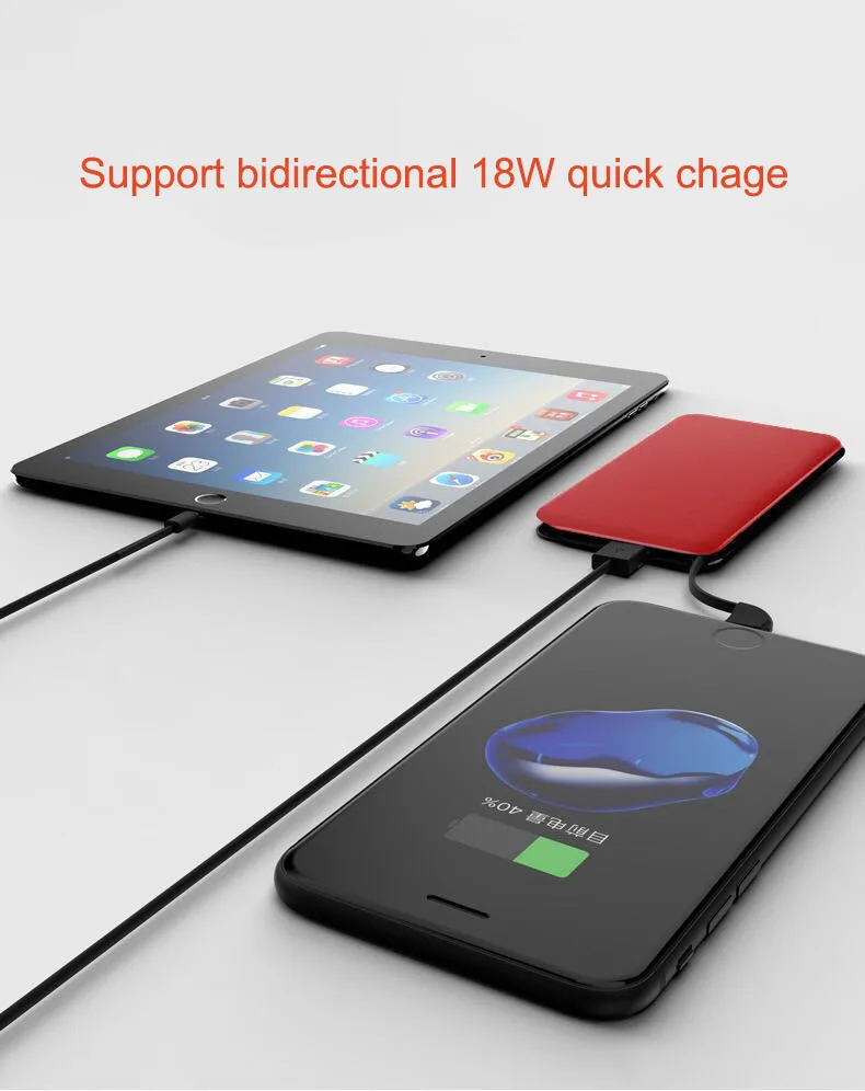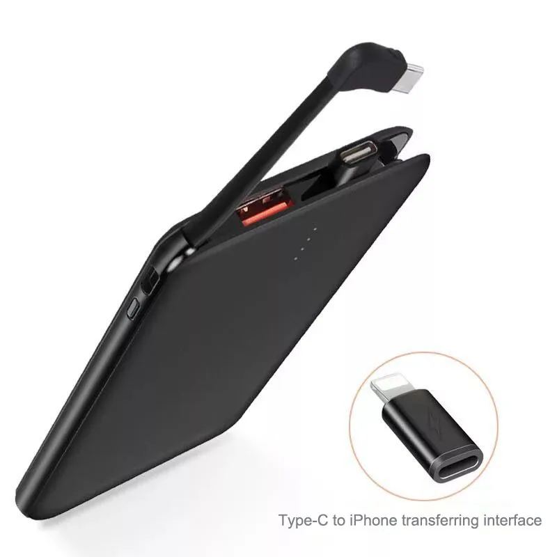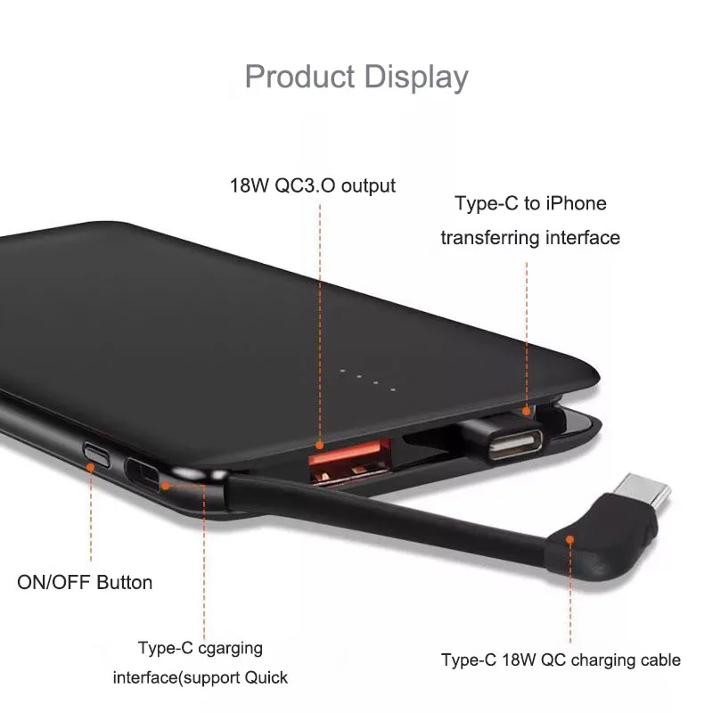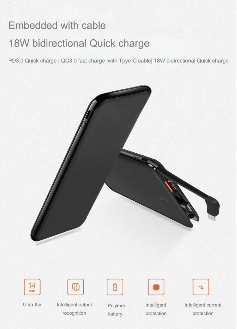 10000 mAh polymer battery 18W QC3.0 fast charge power bank with embedded Type-C charging cable PD3.0