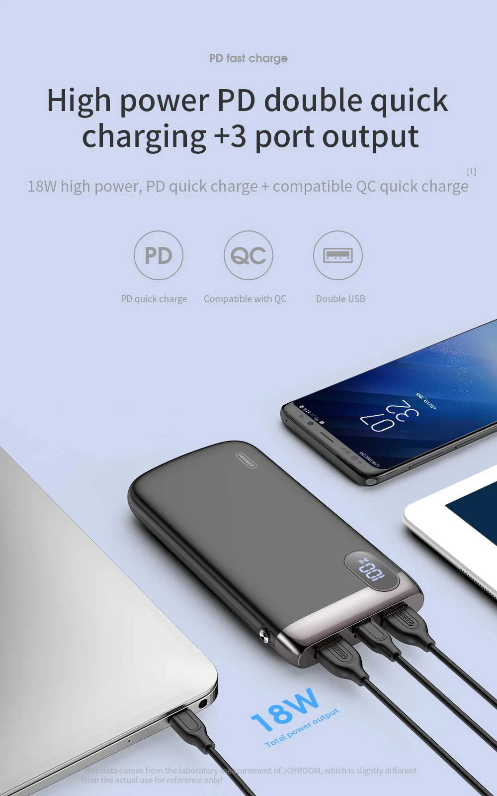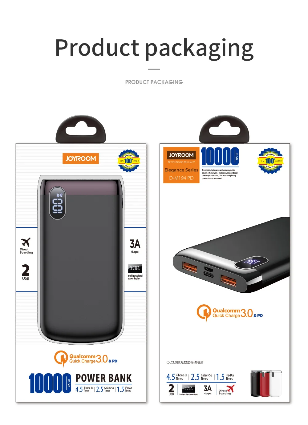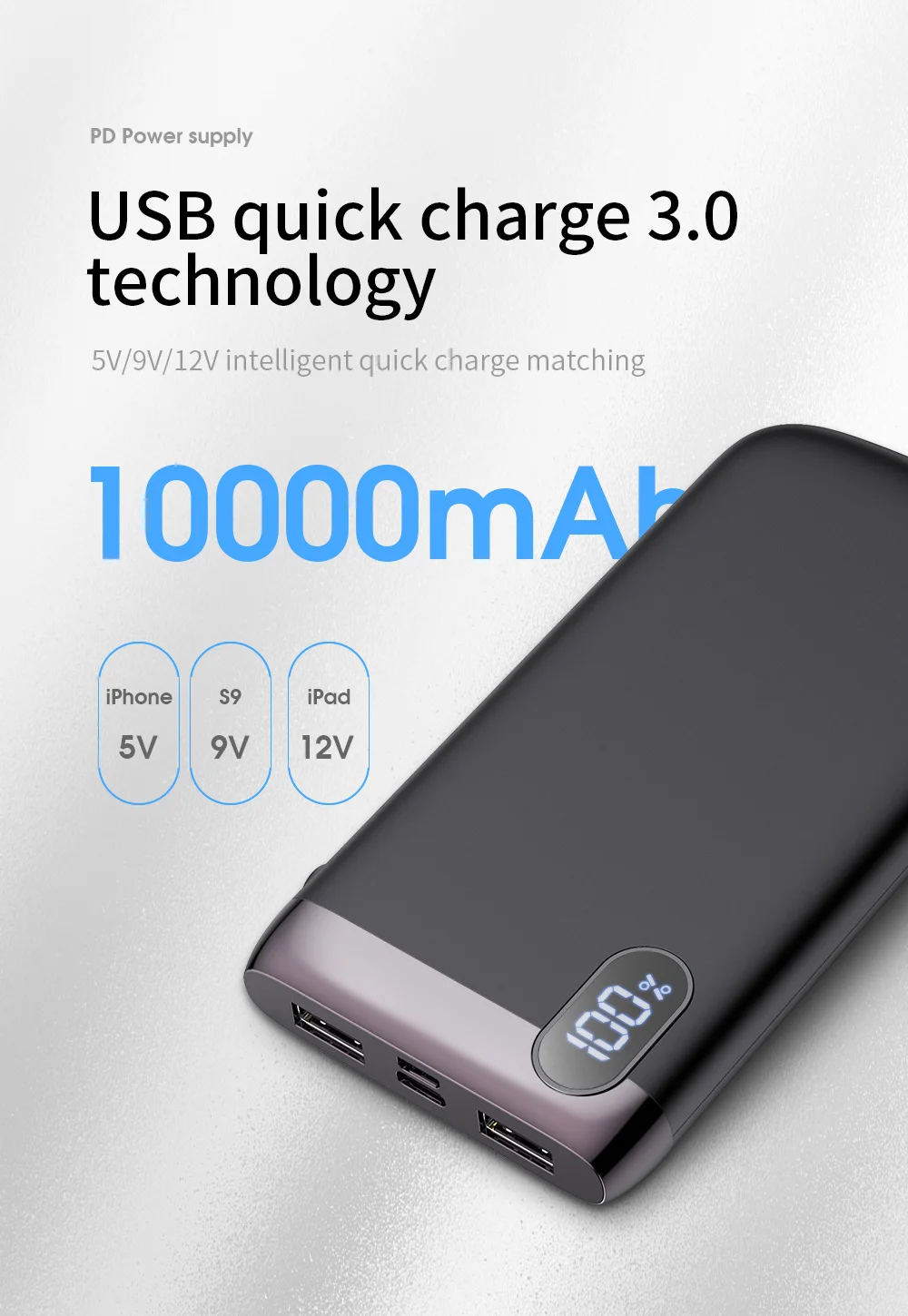 Dual USB ports 10000mAh 5V-12V QC3.0 PD fast charge mobile power bank with USB&Type-C input interfaces