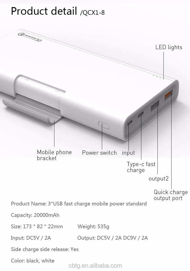 20000mAh Power Bank QC 3.0 Quick Charger Dual Output Type-C Micro USB phone holder