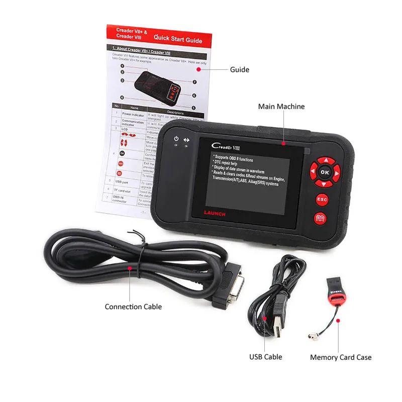 Creader VIII is a comprehensive diagnostic instrument by launch, it not only includes full function of OBDII/EOBD, but also support more functions of four systems Engine , automatic transmission , anti-lock braking system and airbag) of main car models , such as read and reset code , multi-language , data stream graphic display, Data stream storage and playback , and able to provide special function , such as Engine oil reset , reset brake block ,correct steering angle sensor.