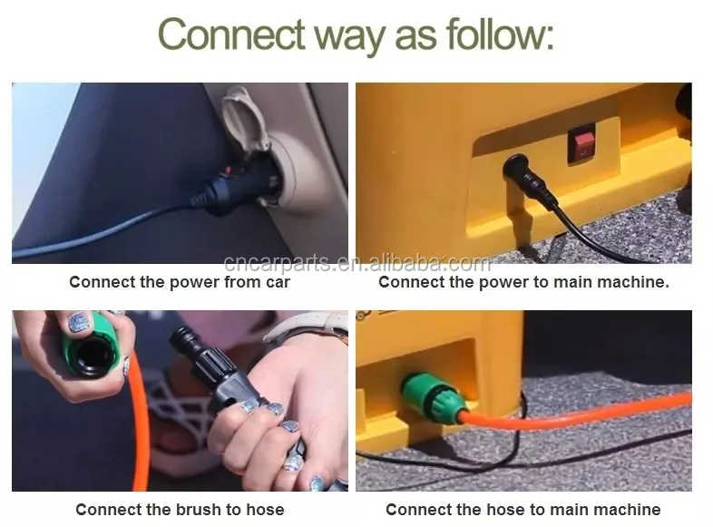Car wash machine is mainly powered by car cigarette lighter(12V/24/48/60V power). The power drive DC micro diaphragm pump, carry water through water pipe, which controlled by a handle switch on spray gun.Water will spray from spray gun or spray brush to clean car and other equipment.The car wash machine also can powered by home power supply.