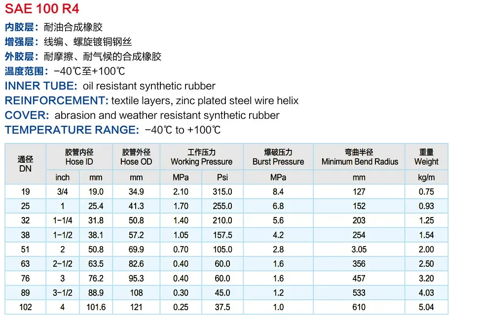 Construction: HYDRAULIC SUCTION HOSE/ SAE 100 R4 shall consist of an inner tube of oil resistant synthetic rubber, a renforcement consisting of a ply or plies of woven or braided textile fibers with a suitable spiral of body steel wire, and an oil and weather resistant synthetic rubber cover.