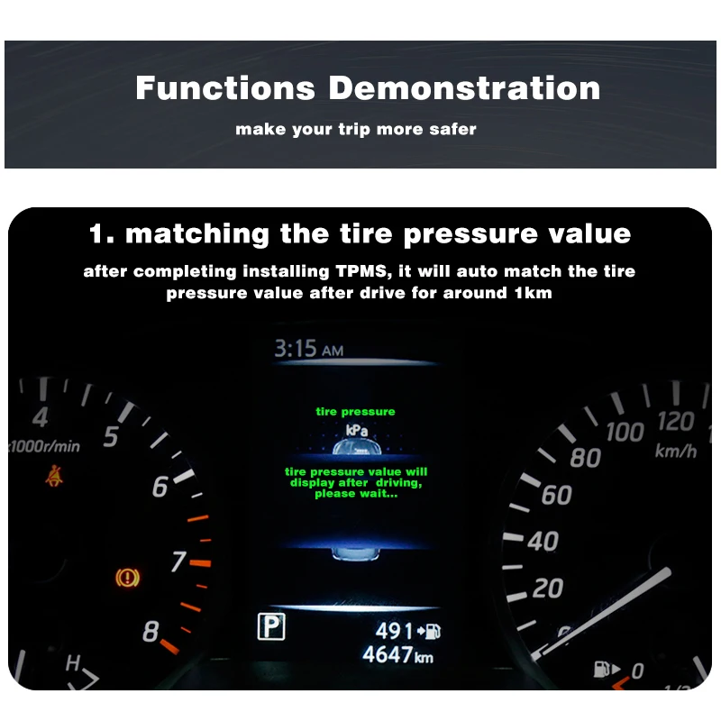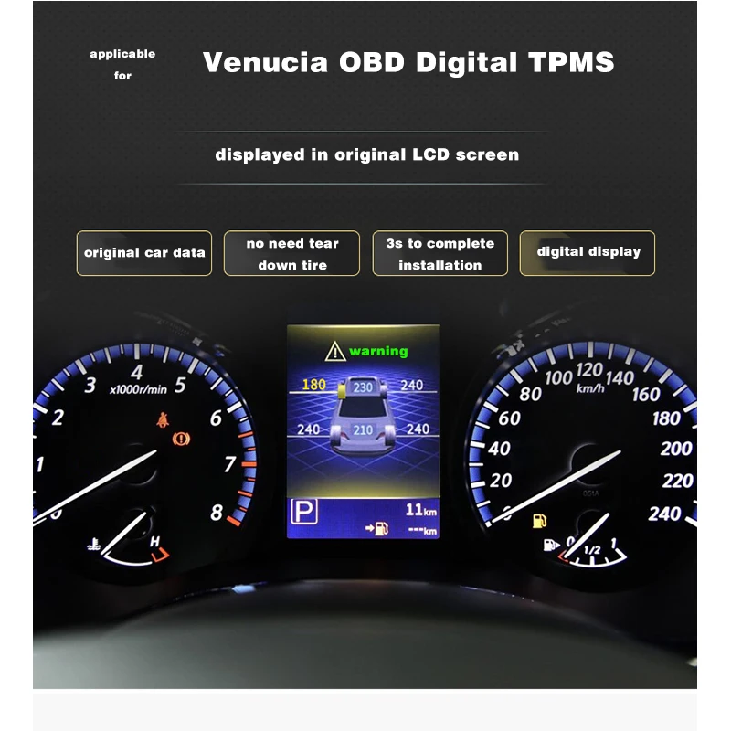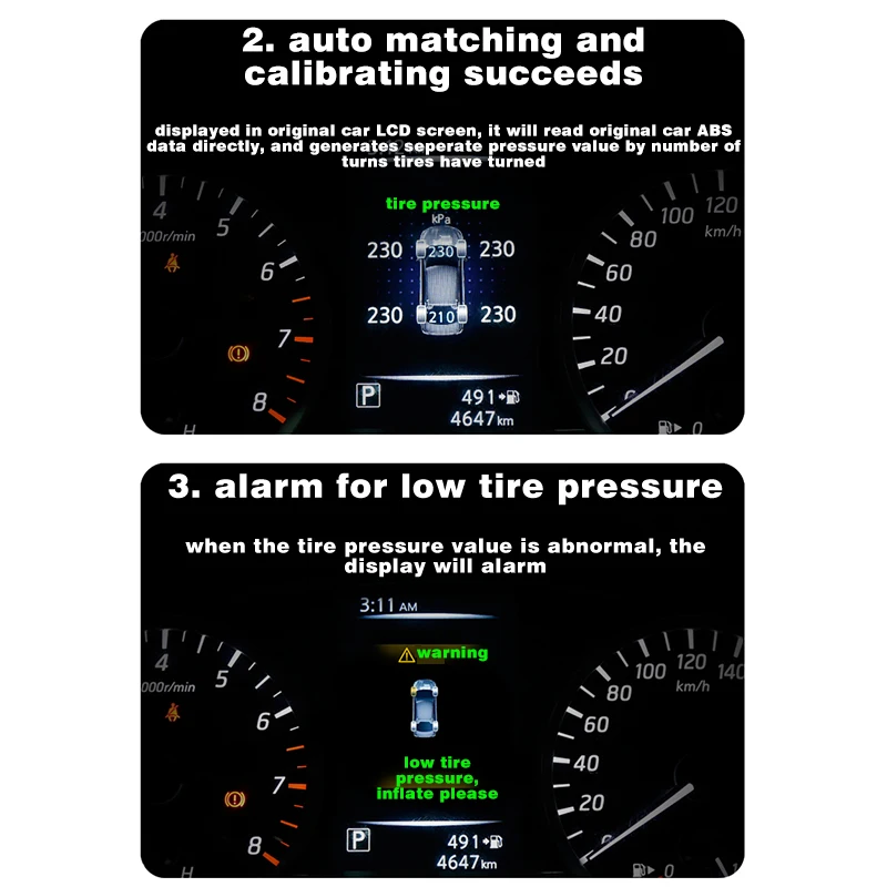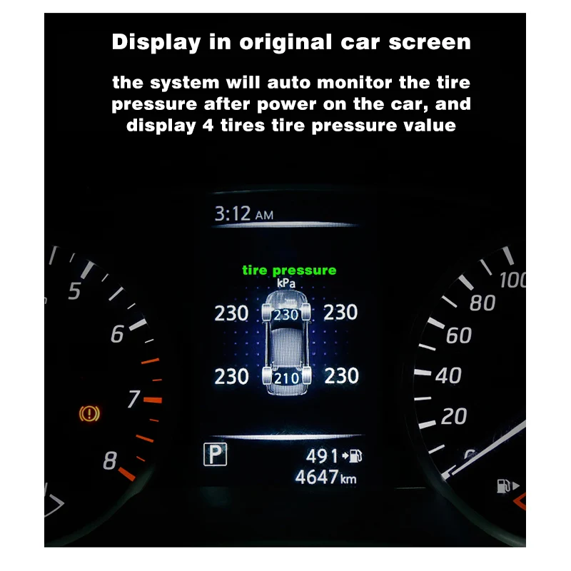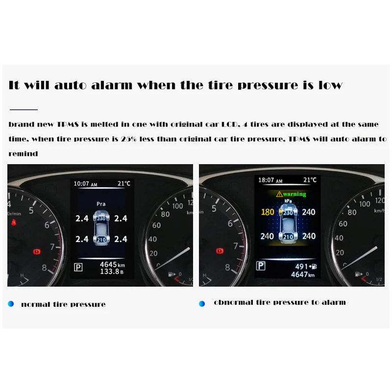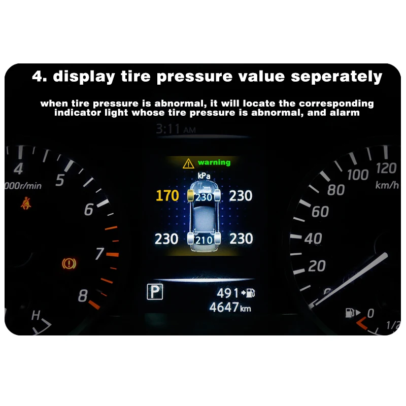 4. Original car digital screen display with specific value of 4 tires, no occupy other space, monitoring is more accurate and precise, looks very beautiful and high-end