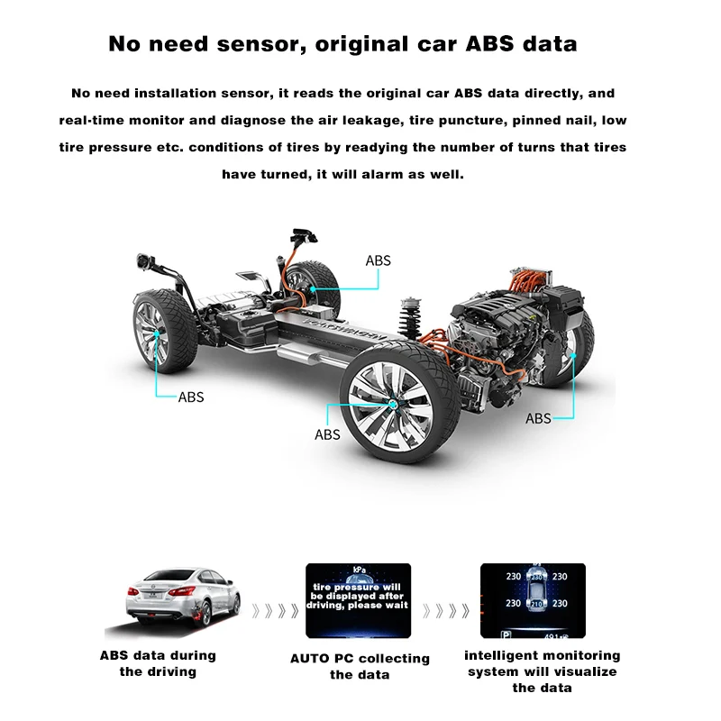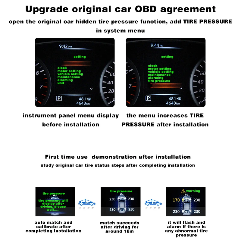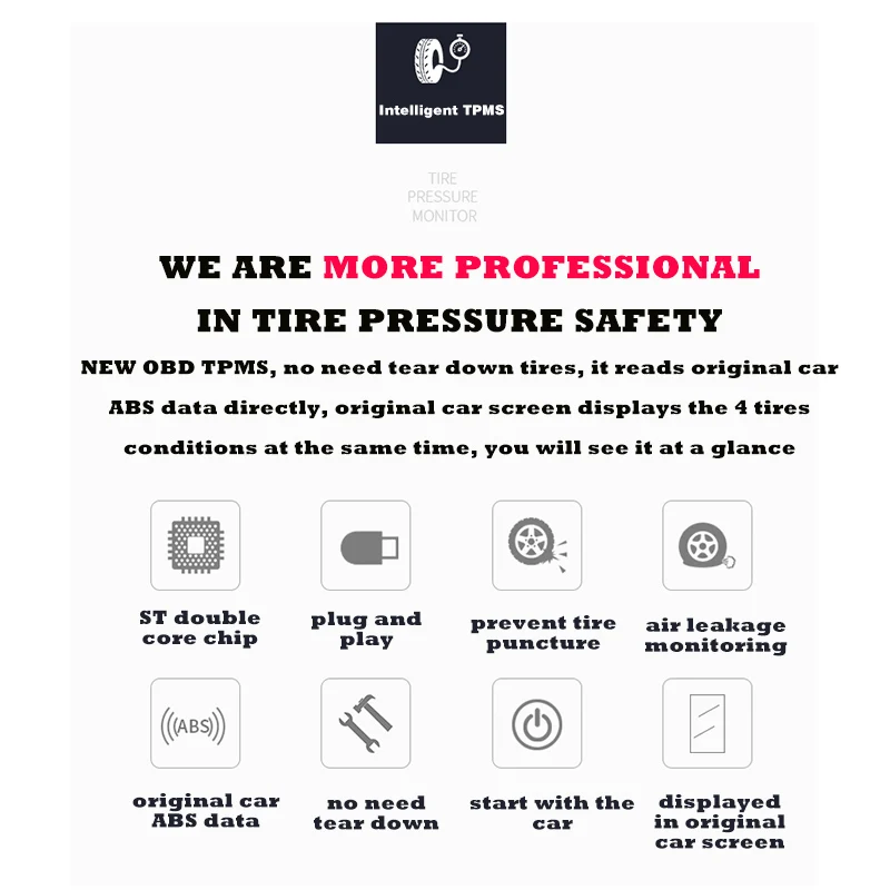 3. Easy installation: OBD plug and play, free of line connection, no need sensor, no need battery, ABS data, no need tear down tire, 3 seconds only to complete the installation
