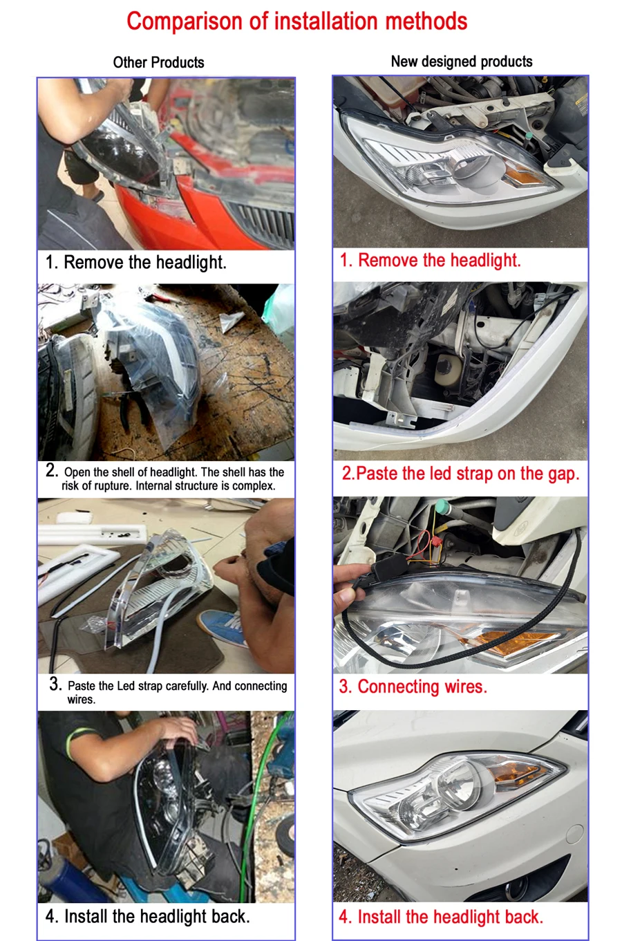 The strip mainly solves the problem of the difficulty of With the Sequential Dynamic Turn Signal turn light and the DRL traffic light.
