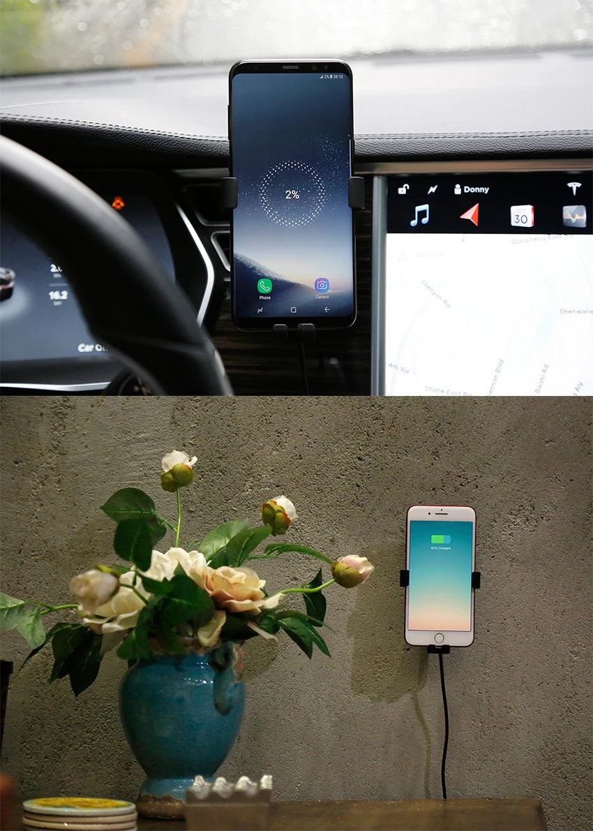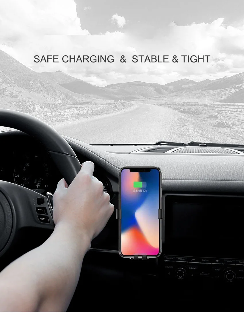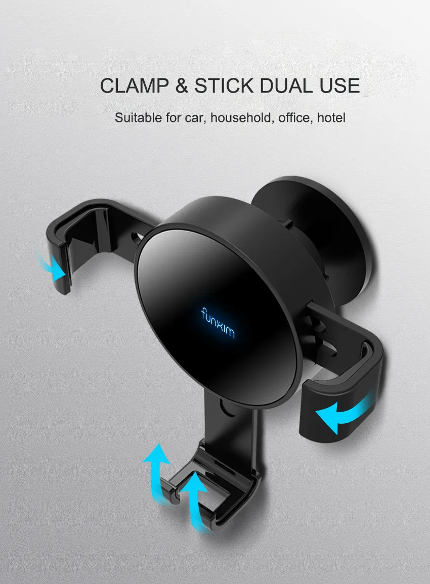 Qi standard 10W fast charge wireless car charger mobile phone holder dual use stick & clamp