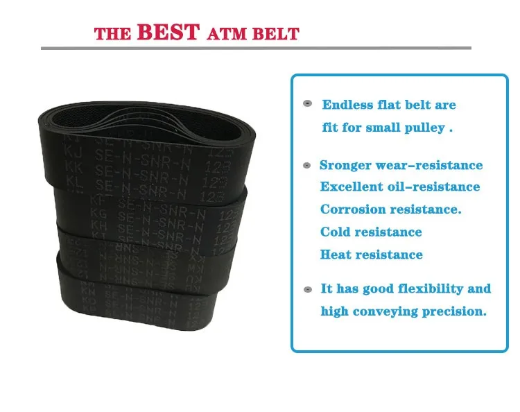 ATM FLAT BELT is one of our super high quality transmission belt . it using UNITTA production technology to gurantee the excellent quality . using rubber as back It has good flexibility, easy installation of belt and high conveying precision.