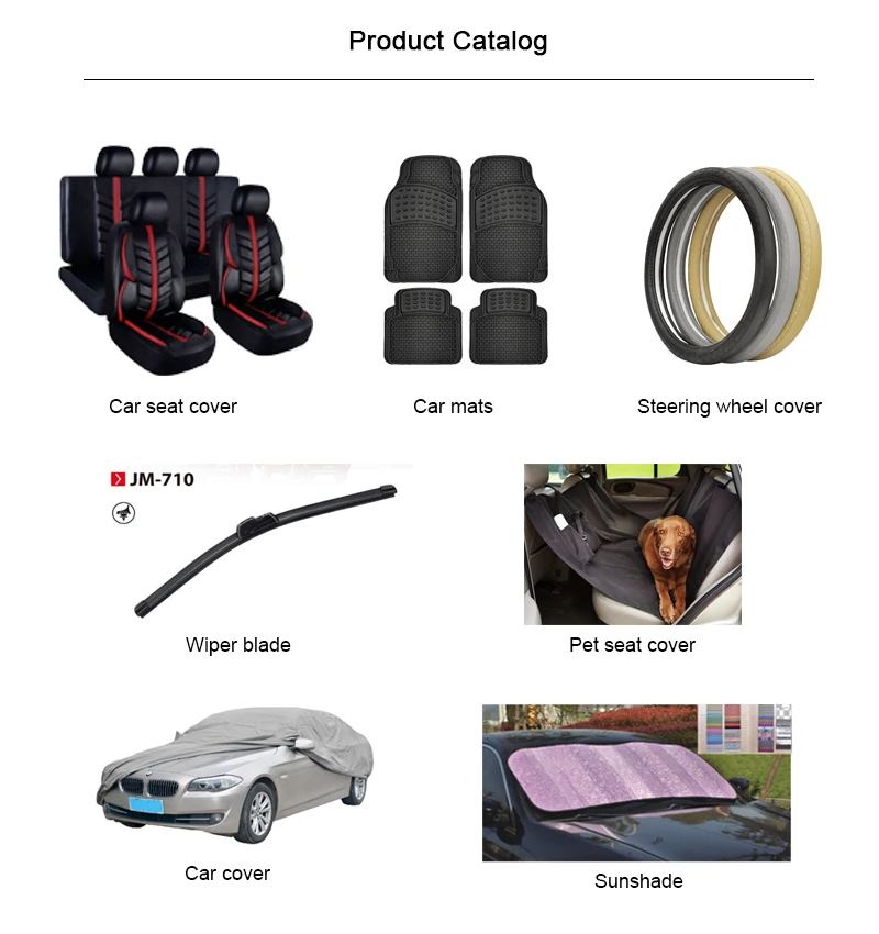 A: Car seat covers, car mats, steering wheel cover, wiper blades, car lights, car air compressors, car electrical accessories and car electronics.