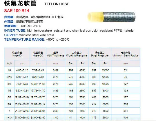 Hot sell Teflon Hortumlar 304 SS wire outer braid convoluted PTFE HOSE R14