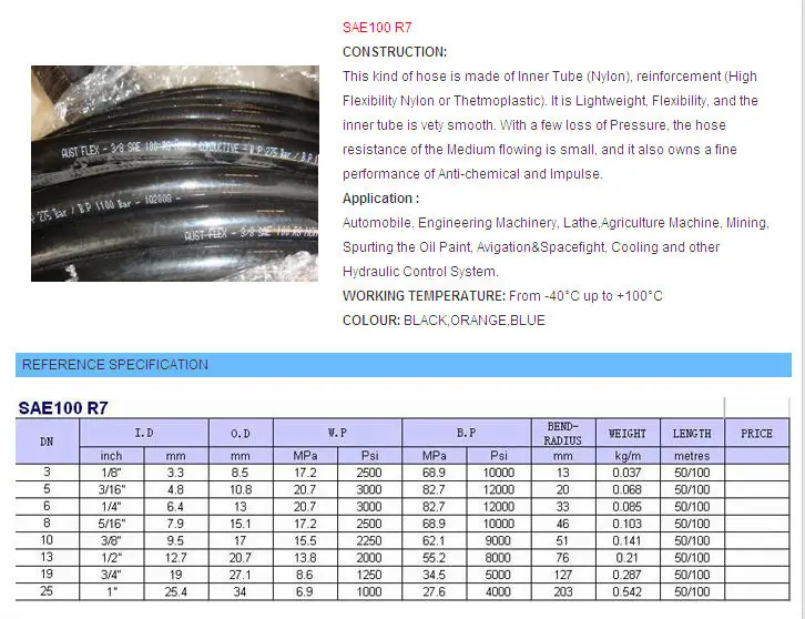 CONSTRUCTION: This kind of hose is made of Inner Tube (Nylon), reinforcement (High Flexibility Nylon or Thetmoplastic). It is Lightweight, Flexibility, and the inner tube is vety smooth. With a few loss of Pressure, the hose resistance of the Medium flowing is small, and it also owns a fine performance of Anti-chemical and Impulse.