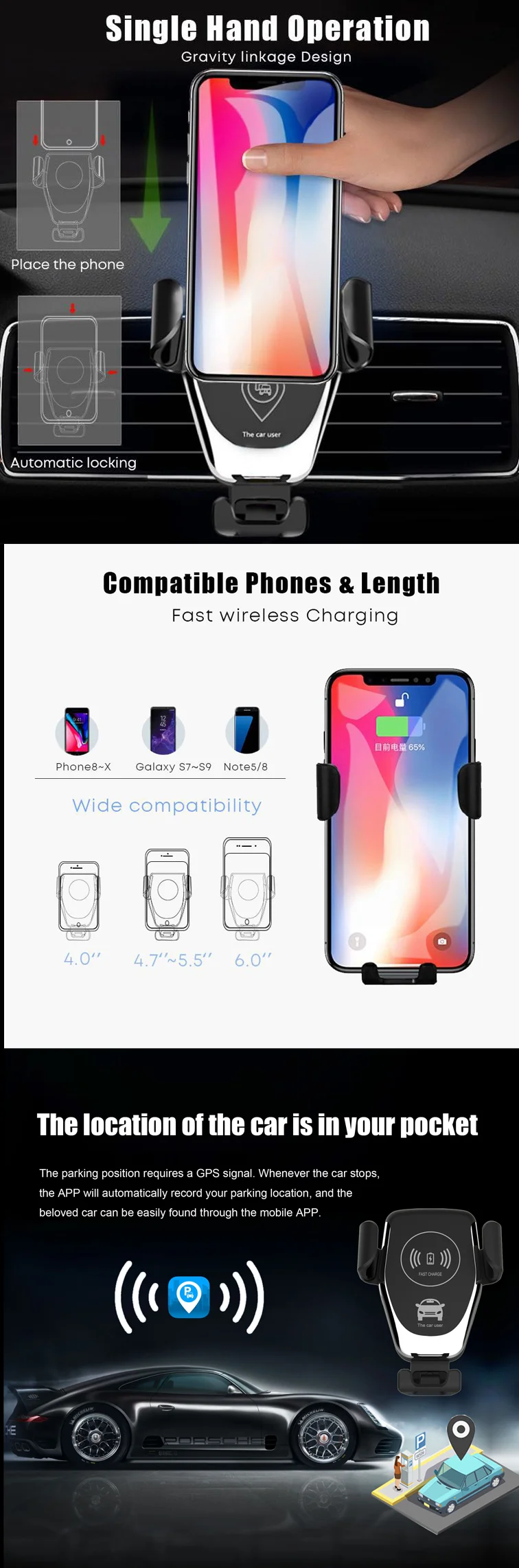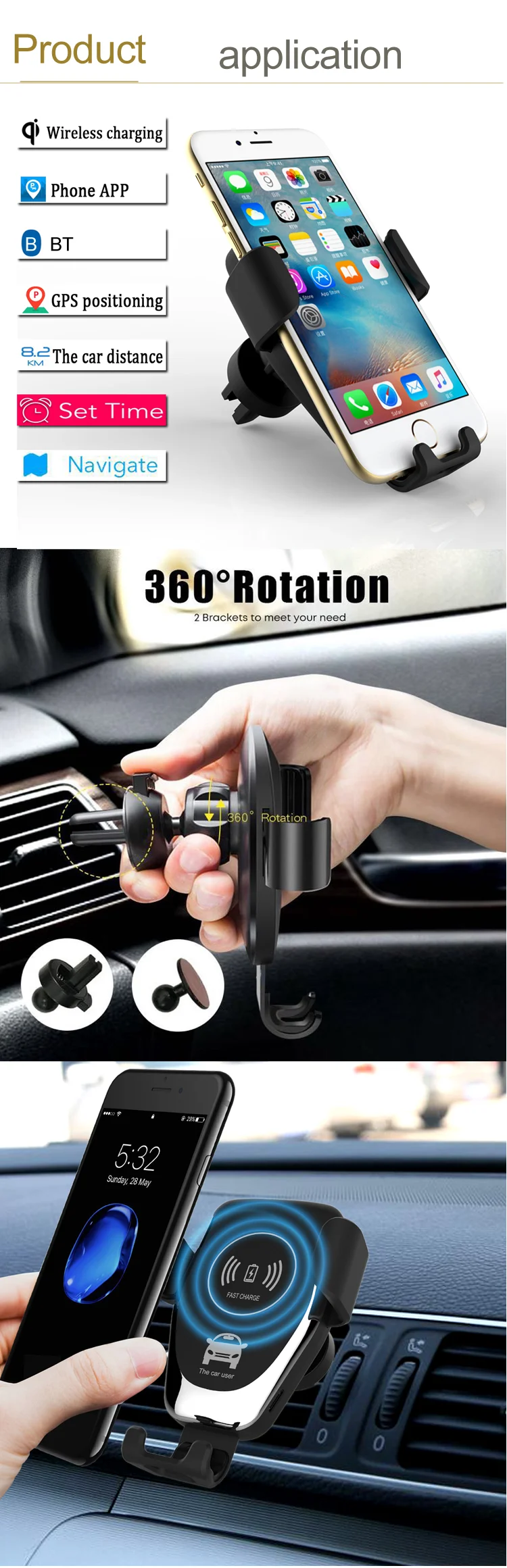 | Features | Automatic Car Wireless Charger Air Vent Phone Mount Holder;Built-in GPS Tracker;Support Samsung 10W and iPhone 7.5W FAST Wireless Charging. |
