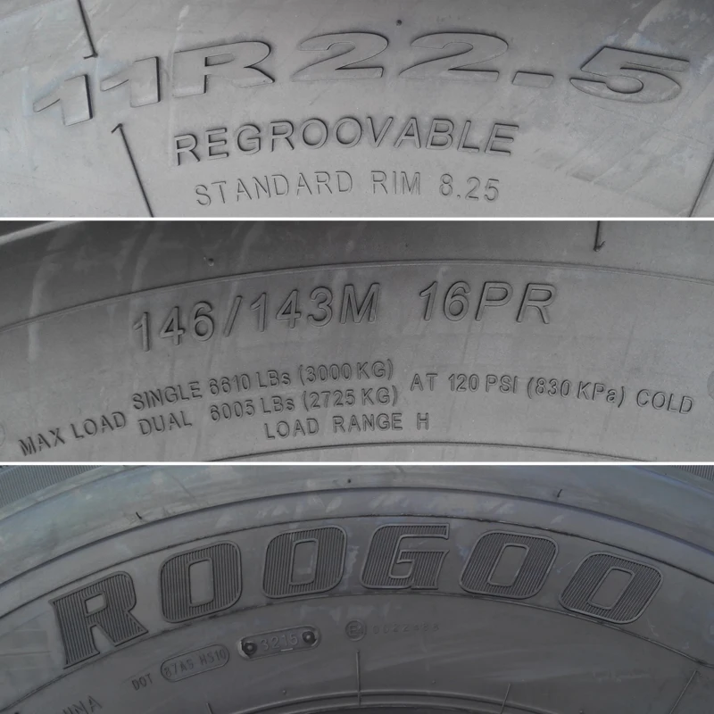 | 11R22.5 | 16 | 20.50 | 146/143 | M | 8.25 | 3000 | 2725 | 830 | 1050 | 279 |